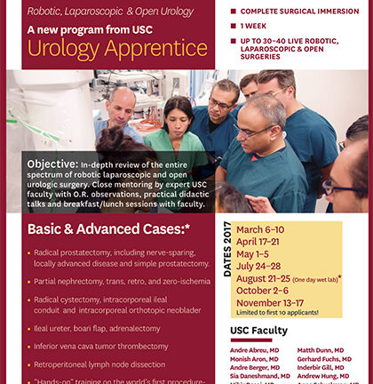 Objective: In-depth review of the entire spectrum of robotic laparoscopic and open urologic surgery. Close mentoring by expert USC faculty with O.R. observations, practical didactic talks and breakfast/lunch sessions with faculty.